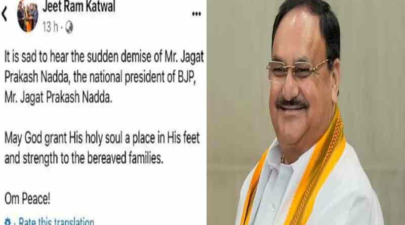 Himachal News : भाजपा विधायक का फर्जी फेसबुक एकाउंट बनाकर पोस्ट की जेपी नड्डा की मौत की खबर।