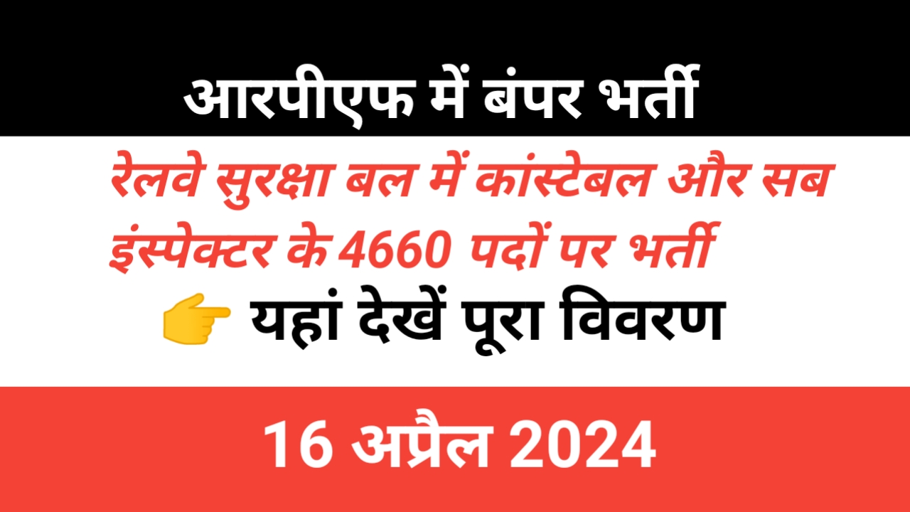 दिल्ली। रेलवे सुरक्षा बल (आरपीएफ) ने 4660 कांस्टेबल और सब इंस्पेक्टर के पदों को भरने के लिए एक आधिकारिक नोटिफिकेशन जारी किया है। ये अधिसूचना रेलवे सुरक्षा बल भर्ती 2024 के अंतर्गत जारी की गई है। रेलवे बचाव बल में 4660 रिक्त पदों को भरने के लिए भर्ती प्रक्रिया शुरू की गई है। आरपीएफ में भर्ती के इच्छुक और योग्य उम्मीदवार सरकारी वेबसाइट पर ऑनलाइन आवेदन कर सकते हैं।