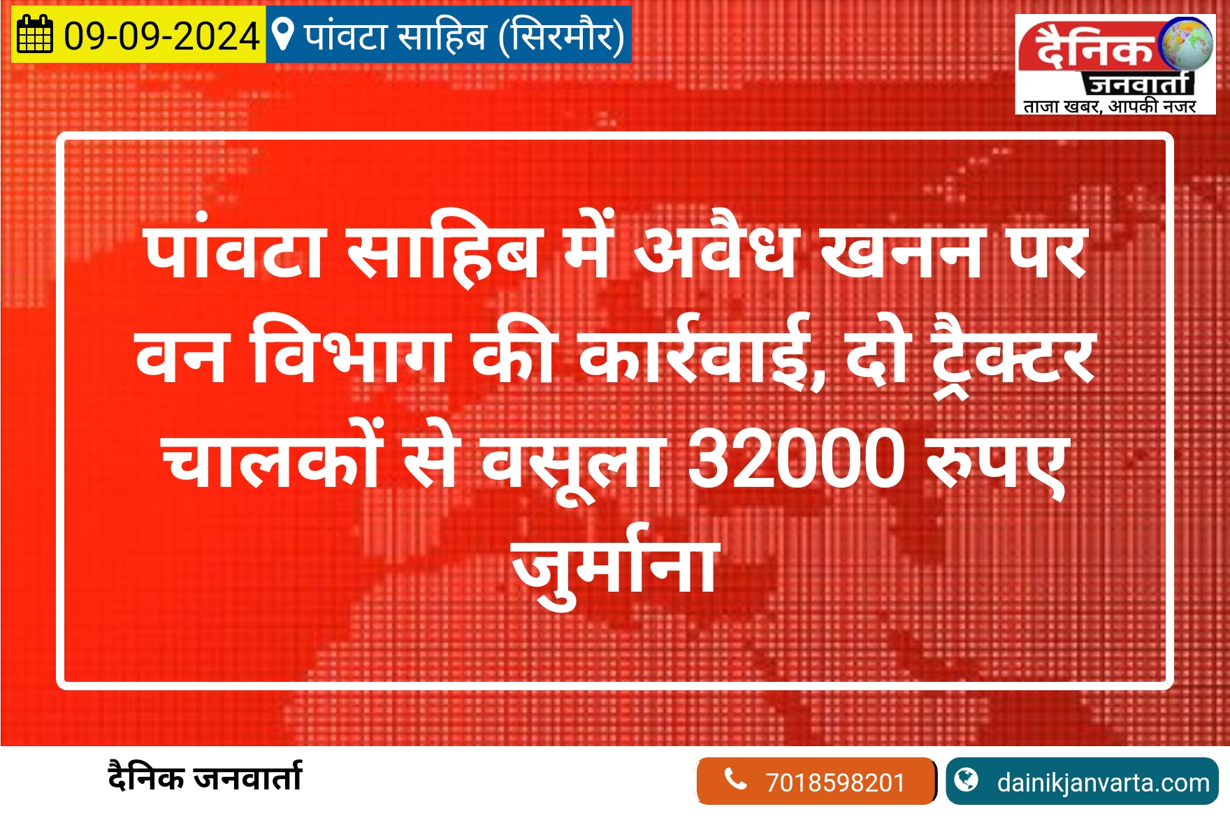 Sirmaur : पांवटा साहिब में अवैध खनन पर वन विभाग की कार्रवाई, दो ट्रैक्टर चालकों से वसूला 32000 जुर्माना