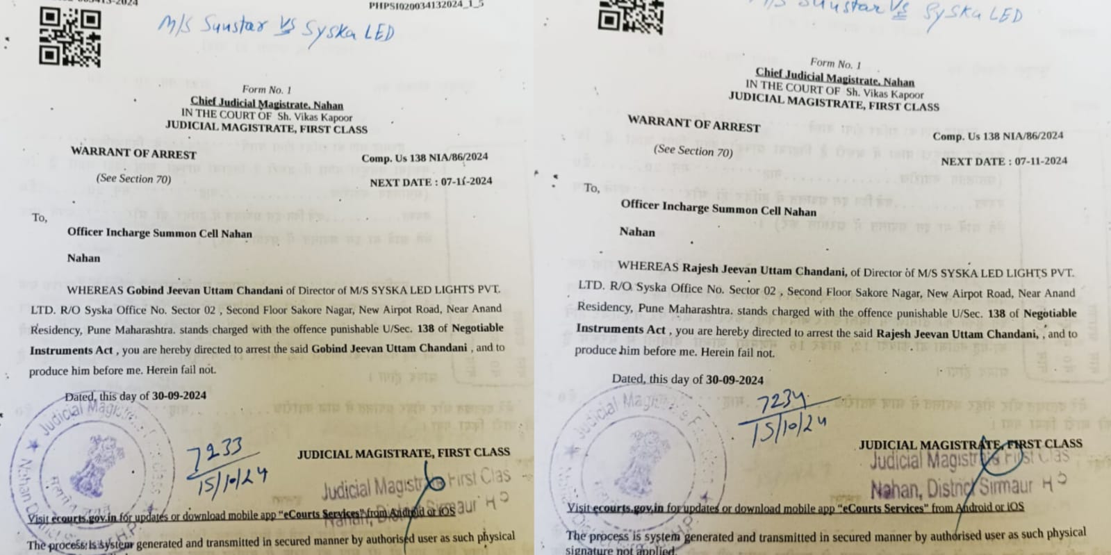 जानकारी के मुताबिक सन स्टार उद्योग कालाअंब ने दो साल पूर्व सिसका एलईडी लाइट्स प्रा. लि. के खिलाफ नाहन अदालत में मुकद्दमा दर्ज कराया था, लेकिन तब से लेकर अब तक सिसका एलईडी लाइट्स के प्रबंधक निदेशक गोबिंद जीवन और राजेश जीवन, निवासी पुणे महाराष्ट्र न्यायलय में पेश नहीं हुए। लिहाजा, ज्यूडिशियल मजिस्ट्रेट, प्रथम श्रेणी विकास कपूर की अदालत से अब उनके खिलाफ गिरफ्तारी वारंट जारी कर न्यायलय में पेश किए जाने के आदेश दिए गए हैं। सन स्टार उद्योग कालाअंब के अधिवक्ता अमृत शाह ने बताया कि सिसका एलईडी लाइट्स प्रा लि पुणे के गिरफ्तारी वारंट न्यायालय ने जारी किए हैं।