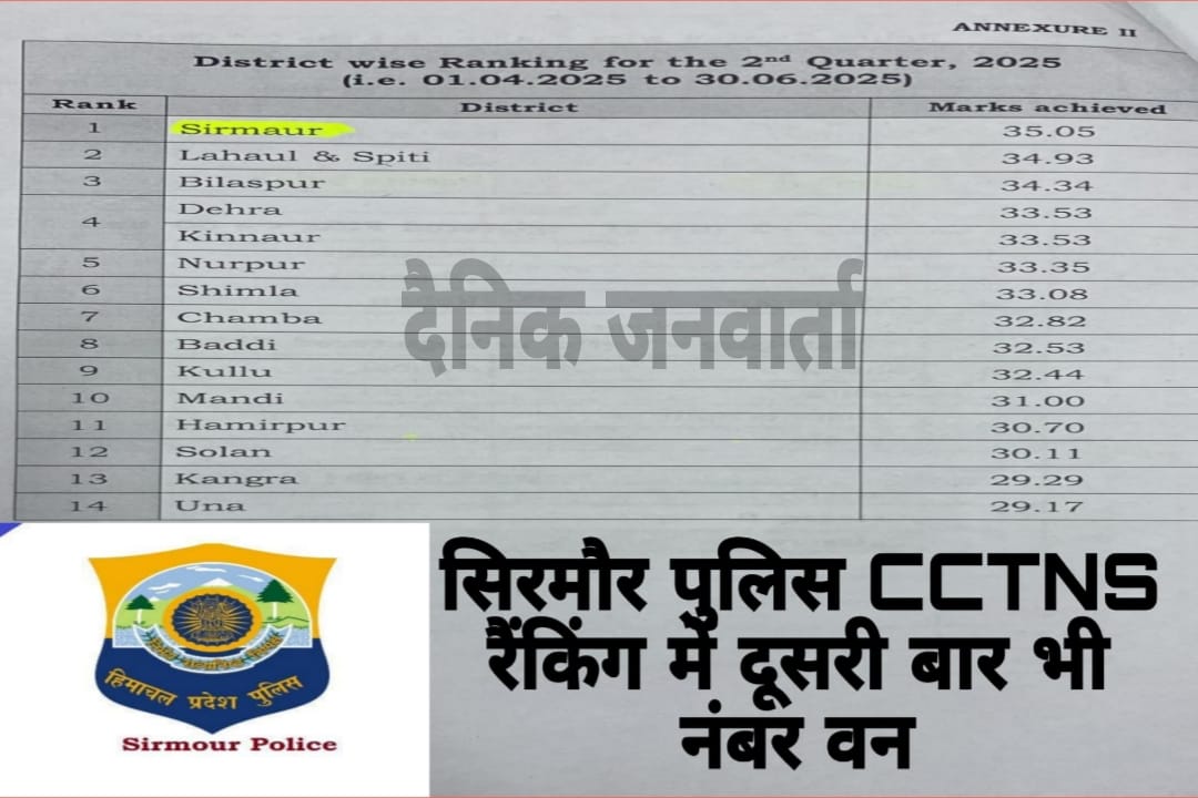 सिरमौर पुलिस ने राज्य अपराध रिकॉर्ड ब्यूरो, शिमला द्वारा जारी CCTNS रैंकिंग 2025 में लगातार दूसरी बार पहला स्थान प्राप्त किया है। यह उपलब्धि पुलिस टीम की मेहनत, समर्पण और तकनीकी दक्षता का परिणाम है।
