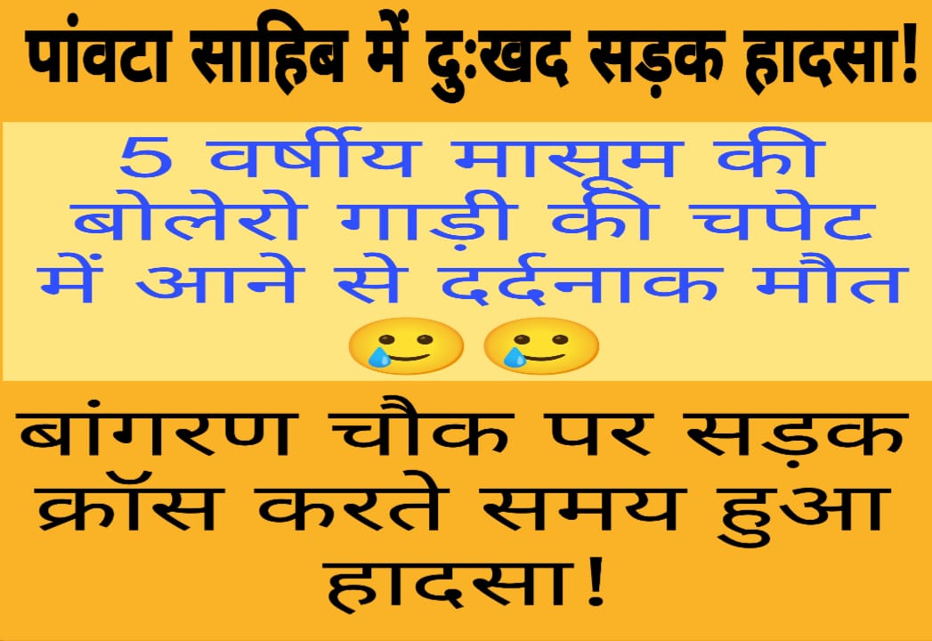 पांवटा साहिब: हिमाचल प्रदेश के सिरमौर जिले में एक दर्दनाक सड़क दुर्घटना ने पूरे क्षेत्र को गहरे सदमे में डाल दिया। पांवटा साहिब के बांगरण चौक पर बोलेरो गाड़ी की टक्कर से 5 वर्षीय मासूम दिव्यांशु की मौके पर ही मौत हो गई। यह भीषण सड़क दुर्घटना शनिवार रात करीब आठ बजे हुई और देखते ही देखते इलाके में मातम छा गया।