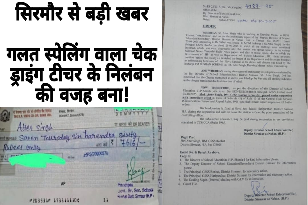जिला सिरमौर का यह मामला आने वाले समय में अन्य शिक्षकों और कर्मचारियों के लिए भी सबक साबित होगा। चेक की गलत स्पेलिंग जैसे मामूली दिखने वाले मामले ने इतना बड़ा रूप ले लिया कि कर्मचारी को तुरंत निलंबित कर दिया गया। विभाग का यह कदम सरकारी कार्यप्रणाली में पारदर्शिता और अनुशासन बनाए रखने की दिशा में अहम माना जा रहा है।