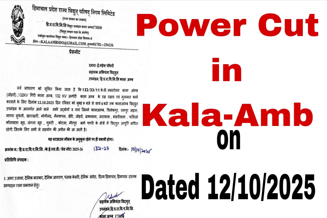 कालाअंब (सिरमौर)। हिमाचल प्रदेश राज्य विद्युत परिषद निगम लिमिटेड के उपमंडल कालाअंब में 132/33/11 के.वी. सब-स्टेशन कालाअंब (जोहड़ों) में आवश्यक रखरखाव एवं सुधार कार्य किए जाएंगे। इसके चलते रविवार 12 अक्टूबर को सुबह 9 बजे से शाम 5 बजे तक बिजली आपूर्ति बाधित रहेगी।