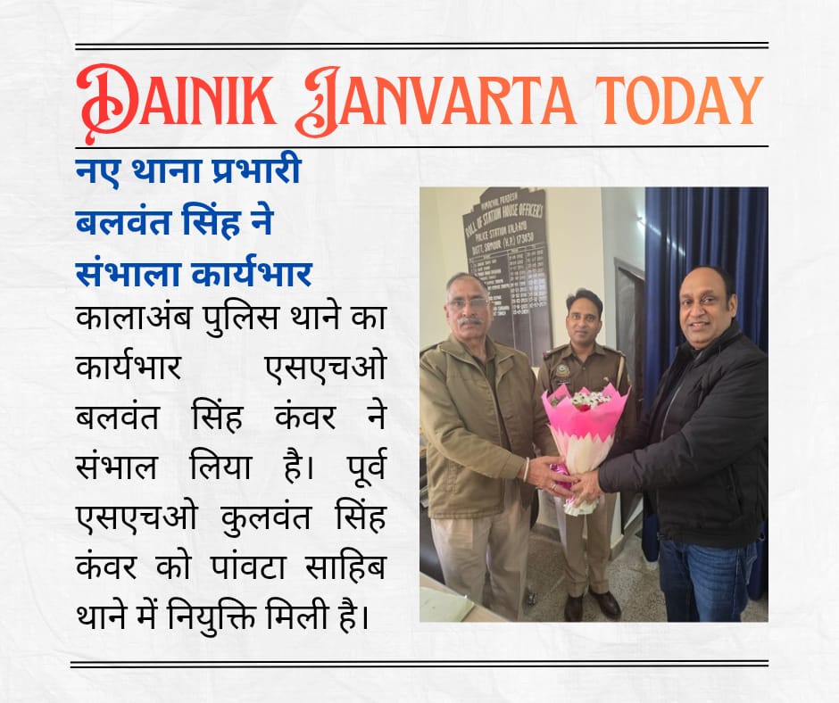 कालाअंब (सिरमौर)। औद्योगिक क्षेत्र कालाअंब में नए थाना प्रभारी के रूप में बलवंत सिंह कंवर ने कार्यभार संभाल लिया है। पदभार ग्रहण करते ही थाना प्रभारी ने क्षेत्र की कानून-व्यवस्था को बेहतर बनाने के लिए स्थानीय उद्योग संगठनों और लोगों से संवाद शुरू किया। इसी क्रम में लघु उद्योग भारती फार्मा विंग के अध्यक्ष संजय सिंगला ने उनसे शिष्टाचार भेंट की और उनका स्वागत किया।