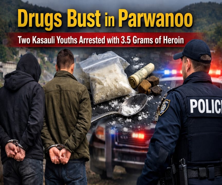 सोलन: जिला सोलन में नशे के खिलाफ पुलिस की कार्रवाई लगातार तेज होती जा रही है। इसी कड़ी में परवाणू पुलिस ने गश्त के दौरान तंबू मोड़ के पास दो युवकों को 3.5 ग्राम चिट्टे (हेरोइन) के साथ गिरफ्तार किया है। पकड़े गए दोनों युवक कसौली क्षेत्र के रहने वाले बताए जा रहे हैं।