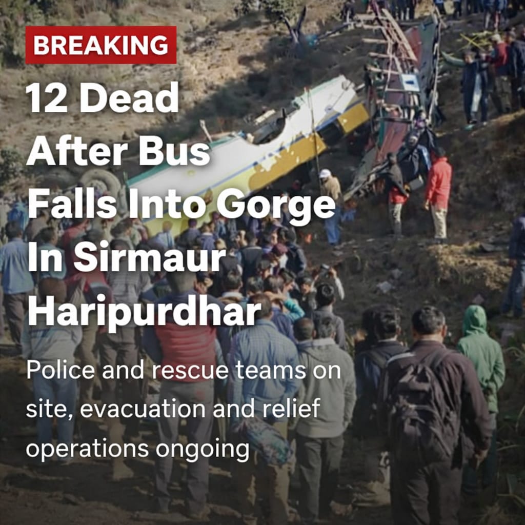 पुलिस अधीक्षक सिरमौर निश्चिंत सिंह नेगी ने कहा कि हरिपुरधार के पास कुपवी से शिमला जा रही एक निजी बस दुर्घटनाग्रस्त हो गई है और वो घटनास्थल के लिए रवाना हो रहे हैं। इस हादसे में अभी तक 14 लोगों की मौत हो चुकी है, जबकि 52 लोग घायल हुए हैं।