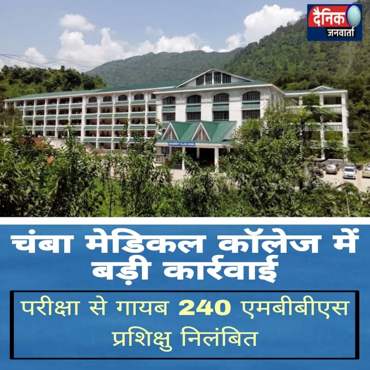 चंबा। पंडित जवाहरलाल नेहरू मेडिकल कॉलेज चंबा में परीक्षा के दौरान बिना सूचना के अनुपस्थित रहने वाले एमबीबीएस प्रशिक्षुओं के खिलाफ कॉलेज प्रशासन ने सख्त कदम उठाया है। वर्ष 2021 और 2025 बैच के कुल 240 प्रशिक्षुओं को सात दिनों के लिए निलंबित कर दिया गया है।