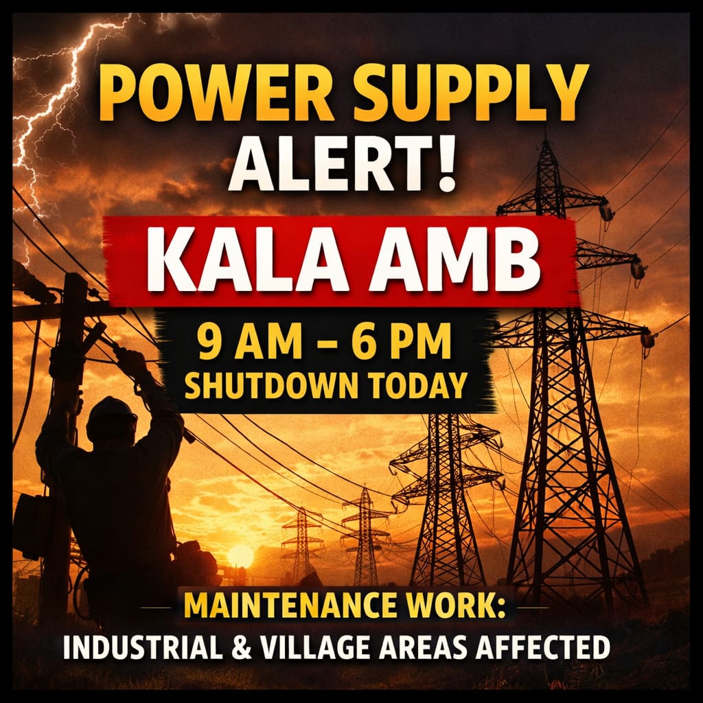 उन्होंने बताया कि निर्धारित कार्यक्रम के अनुसार सुबह 9 बजे से शाम 6 बजे तक कालाअंब क्षेत्र में बिजली आपूर्ति बाधित रहेगी। इस अवधि के दौरान औद्योगिक गतिविधियों के साथ-साथ घरेलू उपभोक्ताओं को भी असुविधा का सामना करना पड़ सकता है।