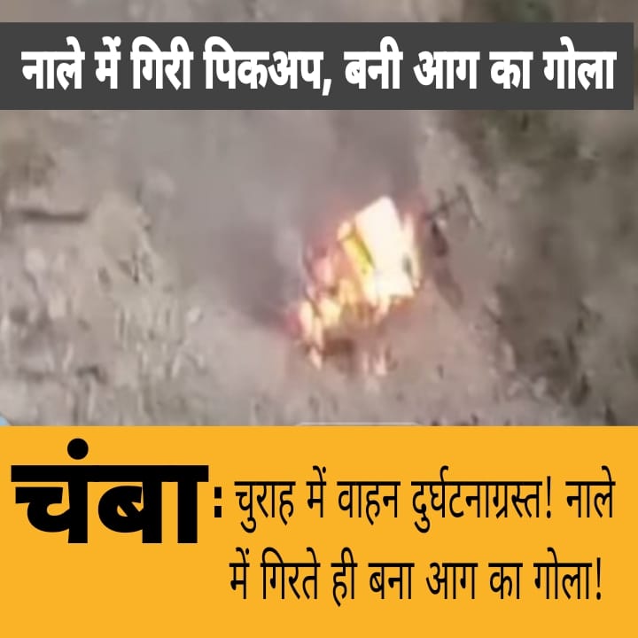 चंबा में बड़ा हादसा: नाले में गिरते ही पिकअप में लगी आग, चालक व साथी ने कूदकर बचाई जान