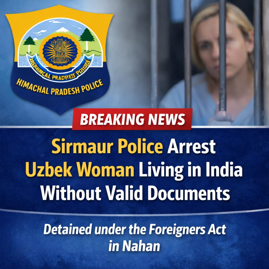 नाहन (सिरमौर)। जिला सिरमौर पुलिस ने भारत में बिना वैध दस्तावेज़ों के पहुंची एक उज़्बेकिस्तान की महिला को गिरफ्तार किया है। पुलिस थाना सदर नाहन में महिला के विरुद्ध Foreigners Act के तहत मामला दर्ज कर जांच शुरू कर दी गई है।