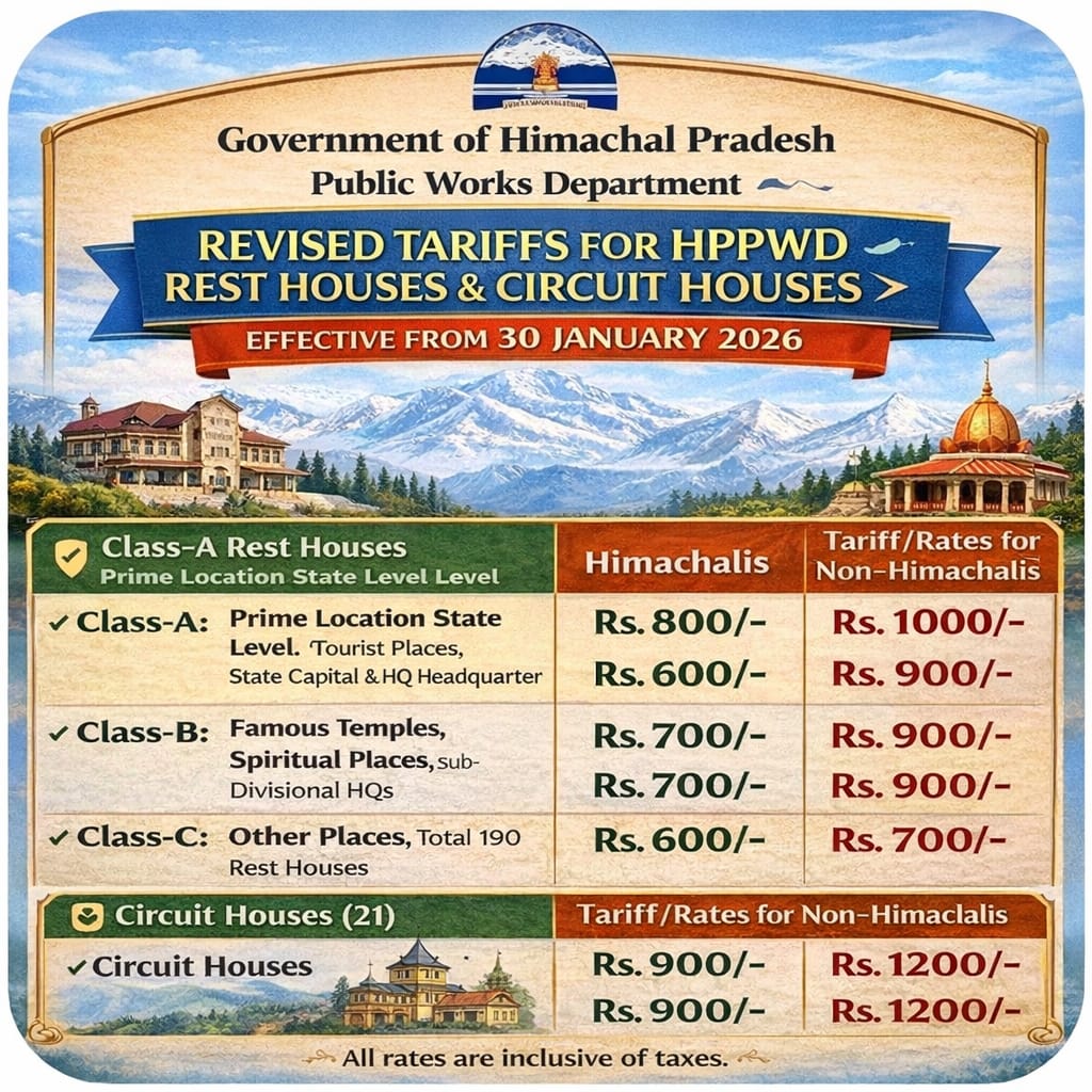 शिमला: हिमाचल प्रदेश सरकार ने यात्रियों और सरकारी कार्य से आने वाले लोगों के लिए बड़ी जानकारी साझा की है। राज्य में लोक निर्माण विभाग (PWD) के सर्किट हाउस और रेस्ट हाउस के कमरों का किराया बढ़ा दिया गया है। सरकार ने कमरे के टैरिफ में संशोधन का निर्णय लिया है, जिसे तुरंत प्रभाव से लागू कर दिया गया है।