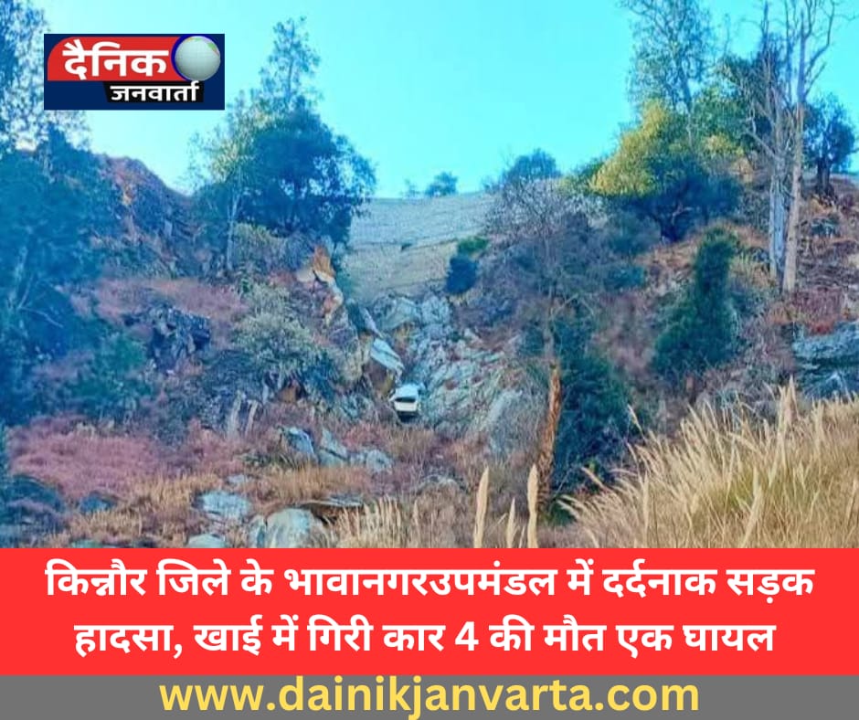 किन्नौर। हिमाचल प्रदेश के किन्नौर जिले के भावानगर उपमंडल में शनिवार सुबह एक बड़ा सड़क हादसा हो गया। जानी लिंक रोड पर एक कार अनियंत्रित होकर गहरी खाई में जा गिरी, जिससे चार लोगों की मौके पर ही मौत हो गई, जबकि एक व्यक्ति गंभीर रूप से घायल हो गया। घायल का उपचार छोल्टू अस्पताल में जारी है।