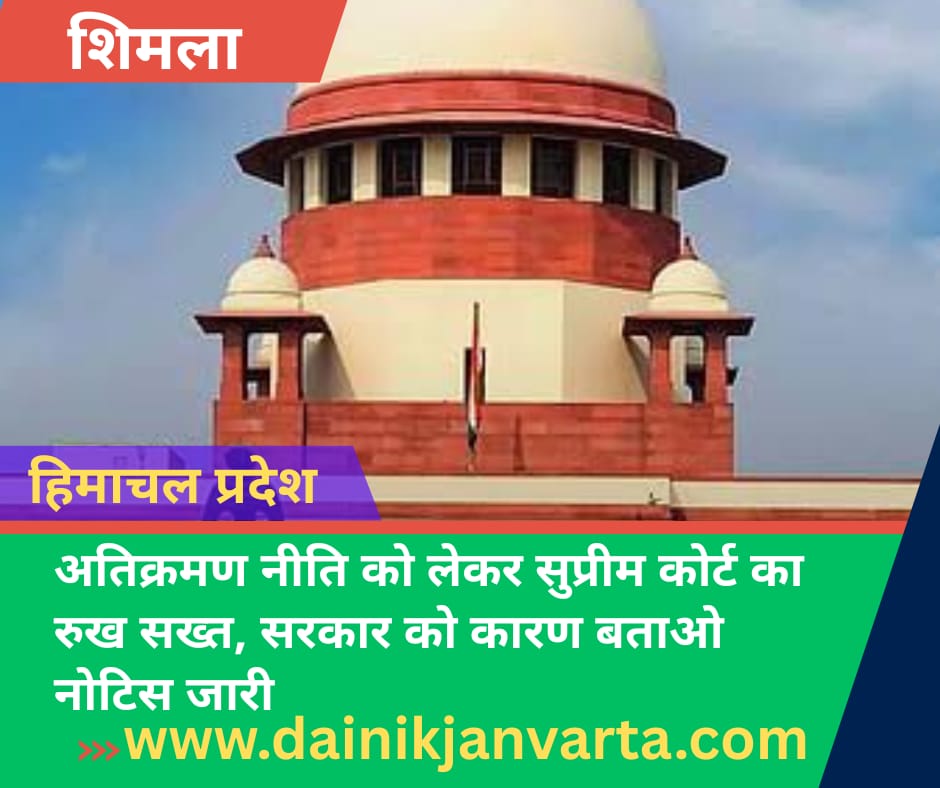 दिल्ली/शिमला। अतिक्रमण मामलों में नीति तैयार करने को लेकर सुप्रीम कोर्ट ने कड़ा रुख अपनाते हुए हिमाचल प्रदेश सरकार को कारण बताओ नोटिस जारी किया है। शीर्ष अदालत ने शिमला जिले के बागी और रतनाड़ी क्षेत्रों में चल रही कार्रवाई तथा अंतरिम आदेशों पर फिलहाल रोक लगा दी है। साथ ही संबंधित मामलों में आगे की किसी भी कार्यवाही पर भी तत्काल प्रभाव से स्थगन लागू कर दिया गया है।