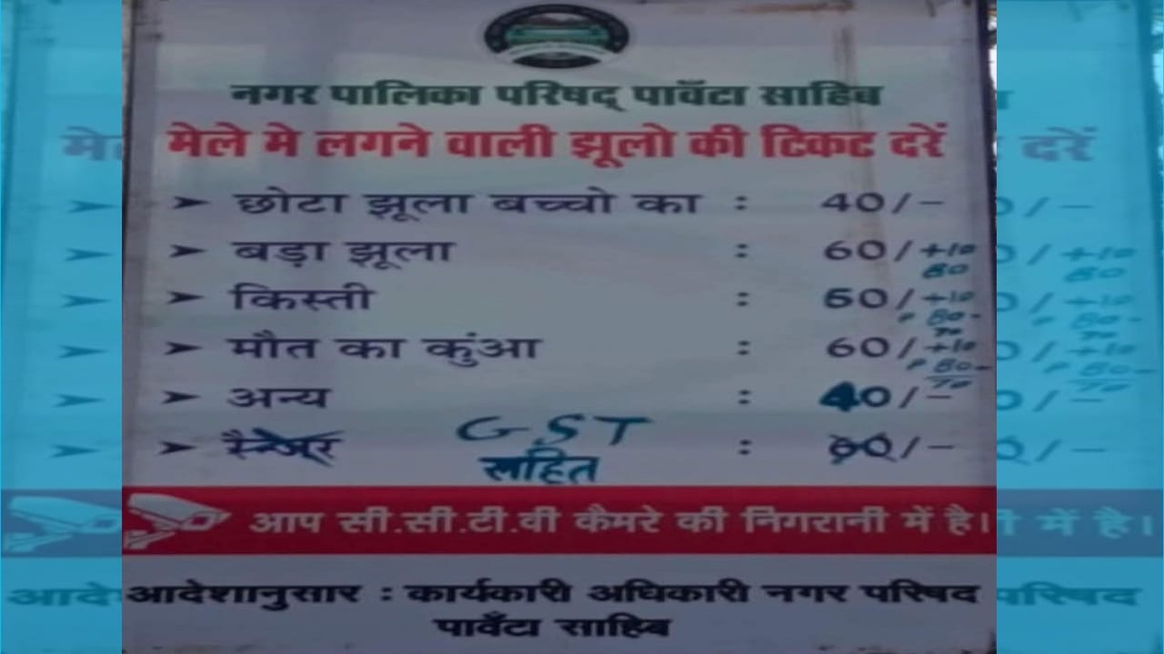 पांवटा साहिब (सिरमौर): पांवटा साहिब में इन दिनों चल रहे होली मेले के दौरान नगर परिषद की एक छोटी सी गलती चर्चा का बड़ा विषय बन गई है। मेले में लगाए गए झूलों के रेट से संबंधित एक बोर्ड सोशल मीडिया और स्थानीय लोगों के बीच खूब चर्चा बटोर रहा है।
