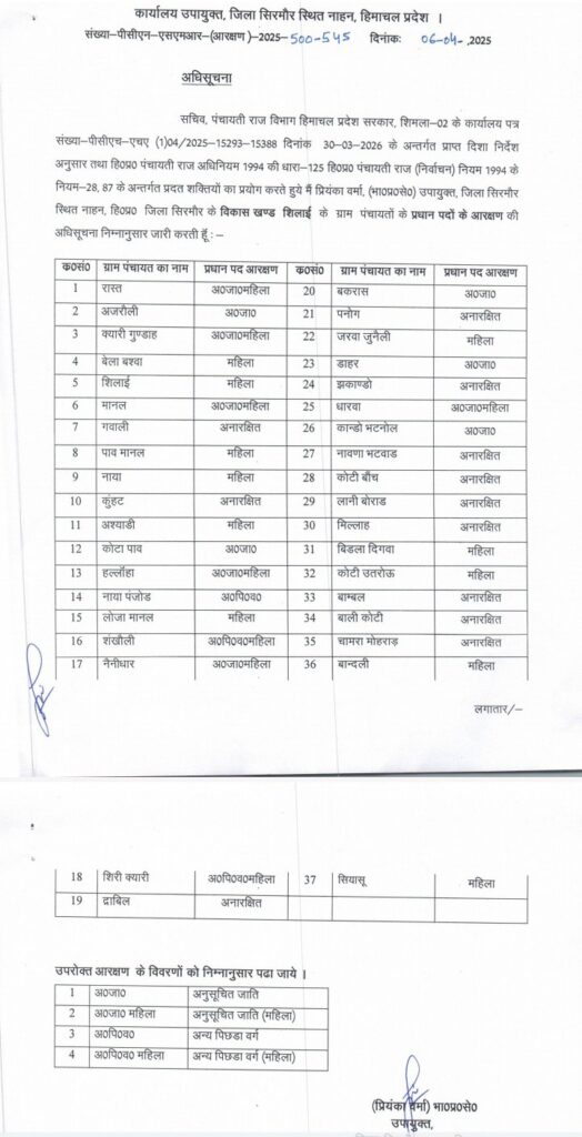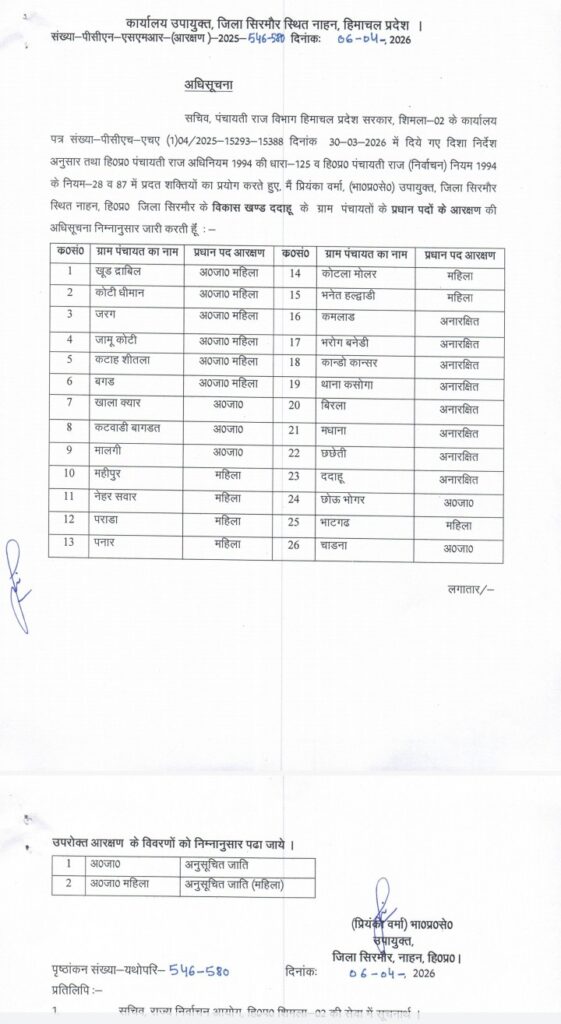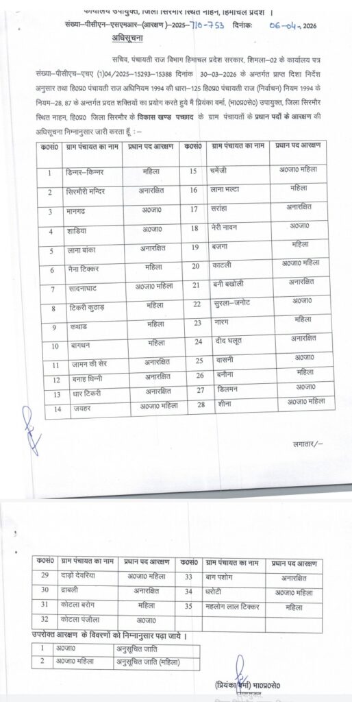 नाहन (सिरमौर)। आगामी पंचायती राज चुनाव को लेकर जिला सिरमौर में आरक्षण रोस्टर जारी कर दिया गया है। उपायुक्त प्रियंका वर्मा द्वारा जारी अधिसूचनाओं के अनुसार जिले में ग्राम पंचायतों के प्रधान पदों, पंचायत समिति सदस्य वार्डों, जिला परिषद सदस्य वार्डों और पंचायत समिति अध्यक्ष पदों का आरक्षण तय कर दिया गया है।