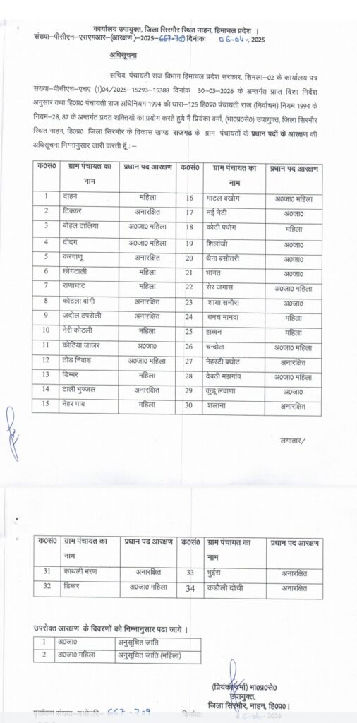 रोस्टर जारी होने के साथ ही अब जिला भर में चुनावी हलचल तेज हो गई है। जिला प्रशासन की ओर से जारी अधिसूचनाओं में सिरमौर के नाहन, पांवटा साहिब, पच्छाद, राजगढ़, शिलाई, संगड़ाह, ददाहू और कमरऊ (तिलोरधार) विकास खंडों की पंचायतों के लिए आरक्षण घोषित कर दिया गया है। इस बार कई पंचायतें और वार्ड महिला वर्ग, अनुसूचित जाति, अनुसूचित जनजाति और अन्य पिछड़ा वर्ग के लिए आरक्षित किए गए हैं, जबकि कई सीटें अनारक्षित भी रखी गई हैं।