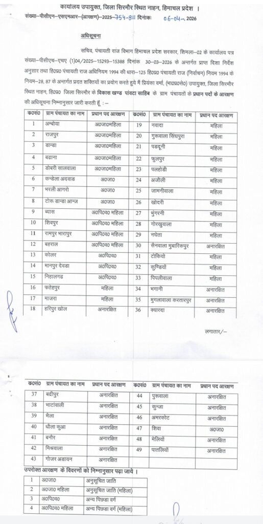 नाहन विकास खंड – ग्राम पंचायत प्रधान पद आरक्षण सूची👇